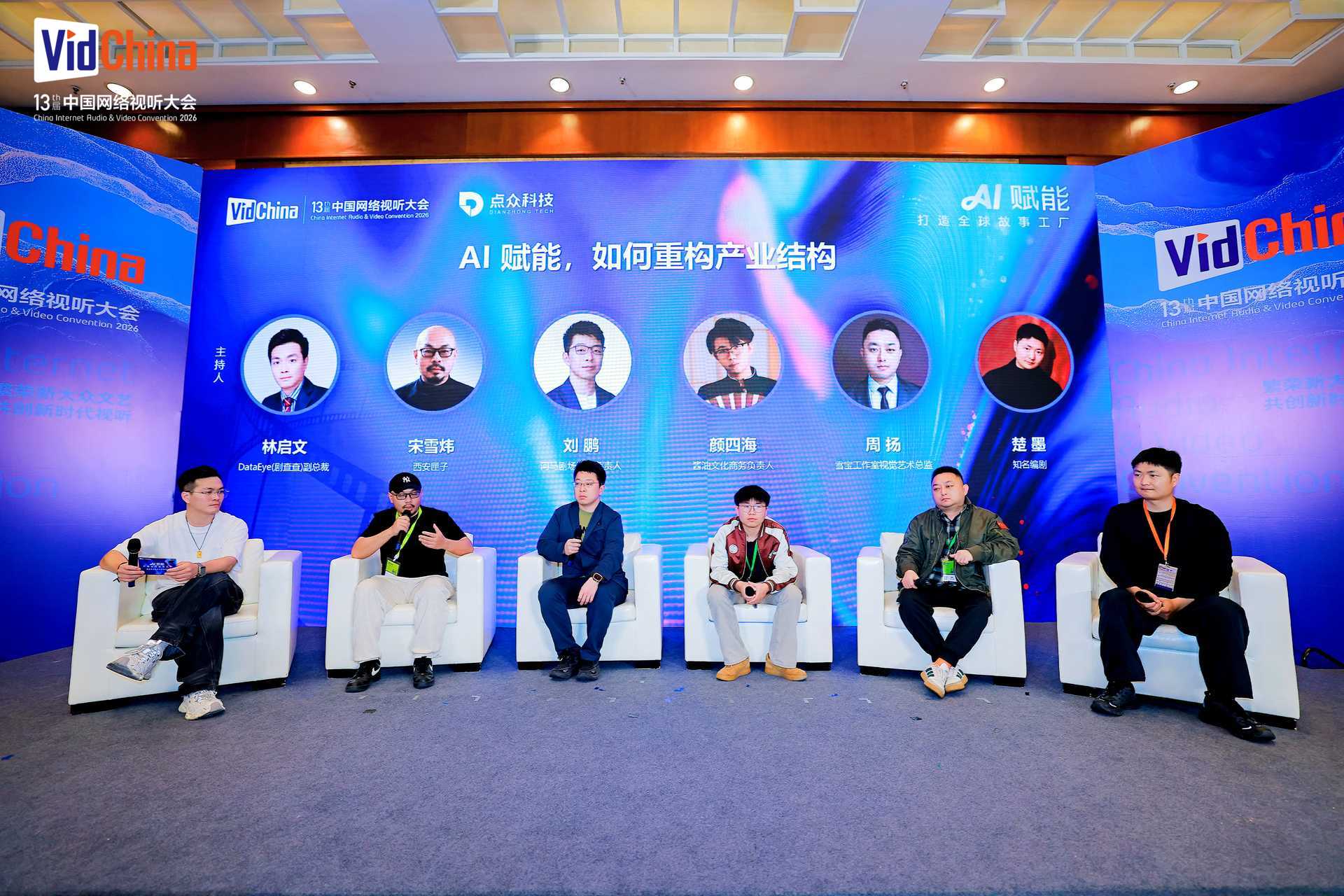 随后,第二场圆桌论坛以“AI赋能,如何重构产业结构”为主题,西安匣子创始人宋雪炜、河马剧场运营负责人刘鹏、酱油文化商务负责人颜四海、雪宝工作室视觉艺术总监周扬、编剧楚墨,共同探讨了AI如何重构微短剧生产流程,从IP源头产生更多优质故事。