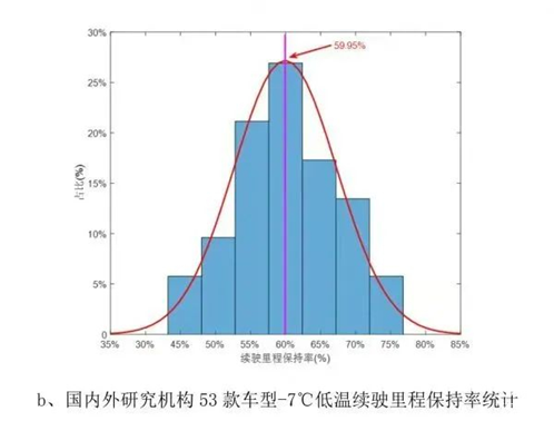 根据2021年12月31日,中国汽研和新能源汽车国家联盟发布白皮书称,国内外近10年累计53款新能源汽车的低温衰减数据表明,2012年-2021年期间,新能源汽车的低温续驶里程保持率平均值及分布范围并未发生显著变化,65.38%的新能源汽车在低温环境下的续驶里程保持率处于52.8%-67.2%左右。