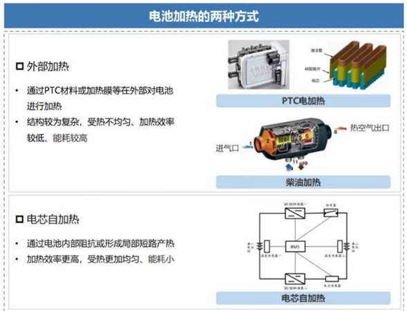 既然低温是“病因”,那让电池“暖和点“不就解决问题吗?其实在过去的几年当中,汽车工程师们花费了大量的精力去思考如何让电池在寒冷的冬天快速升温。很多国产电动汽车都配备“电池加热或预加热”的功能。目前主要有外部加热和自加热两种思路。